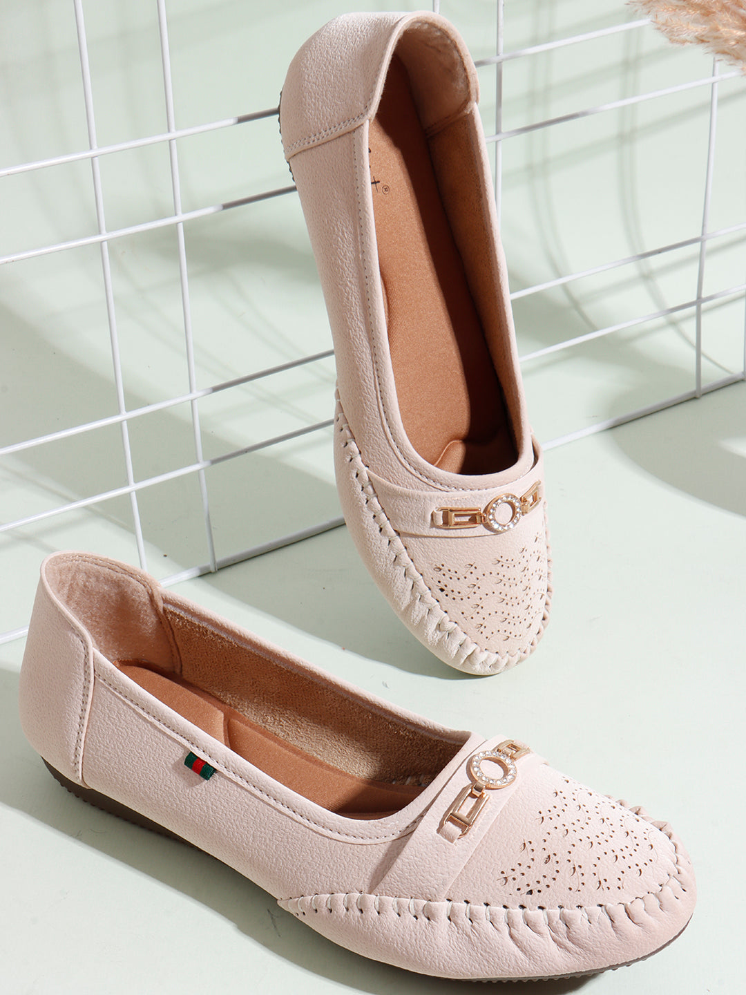 Toe Design: Perforated pattern with decorative metallic bit
