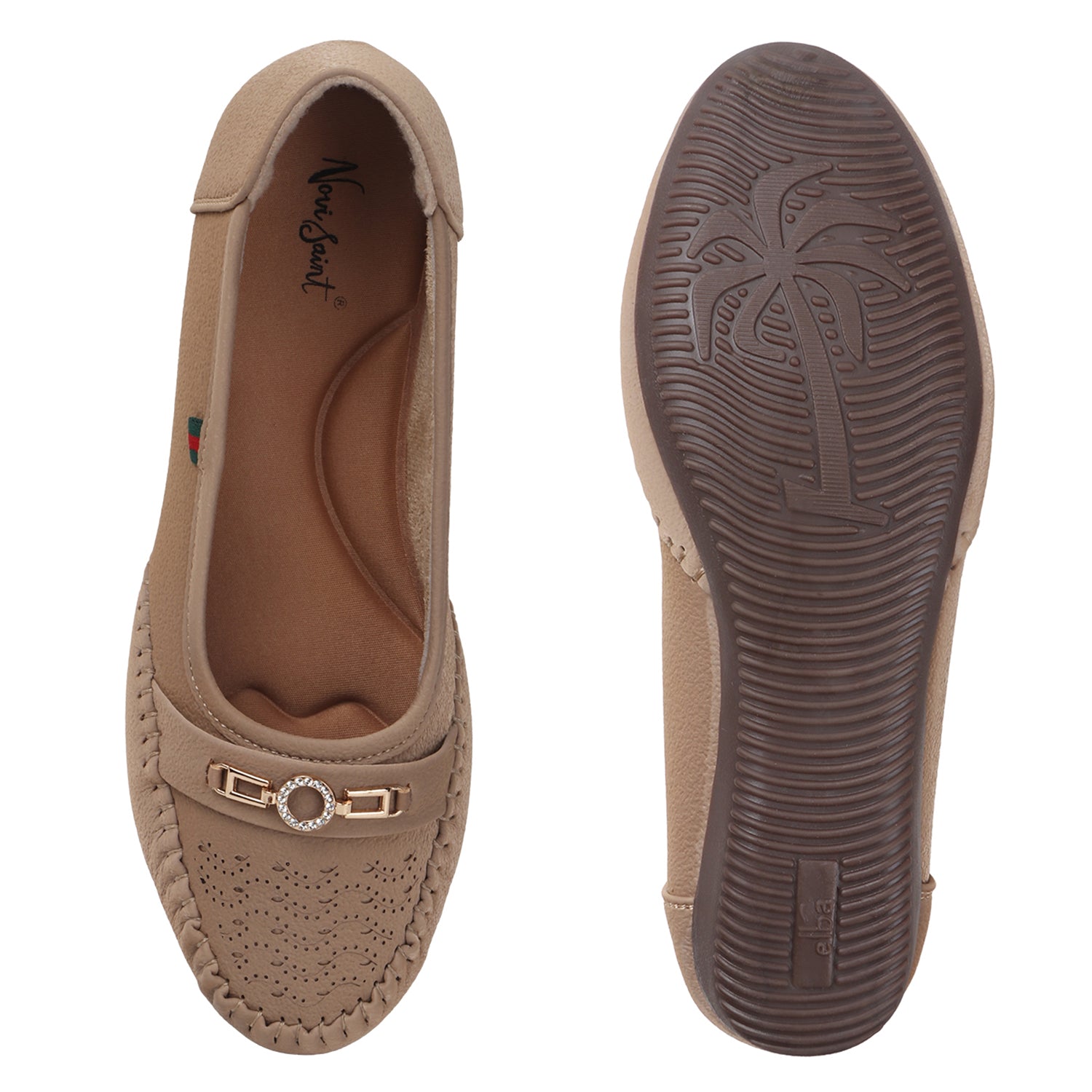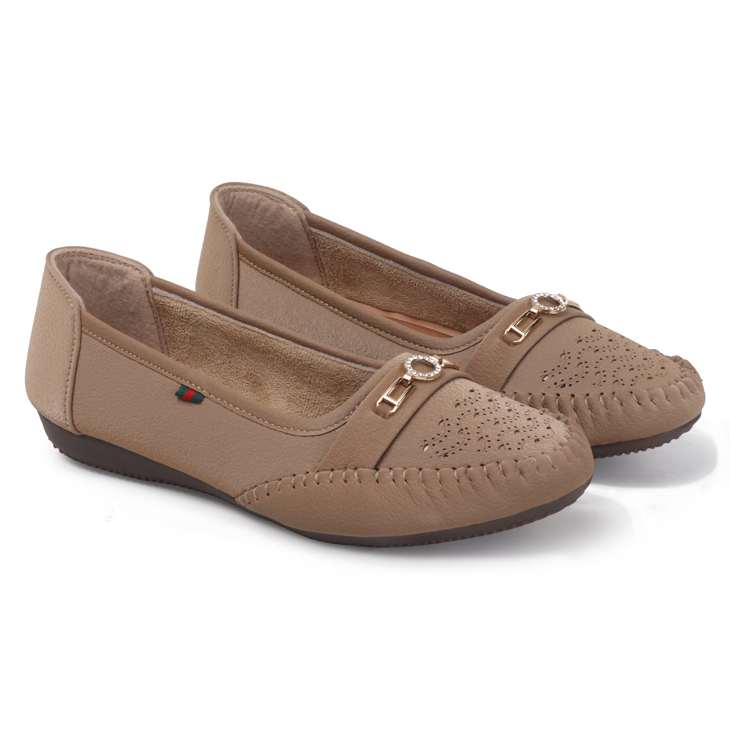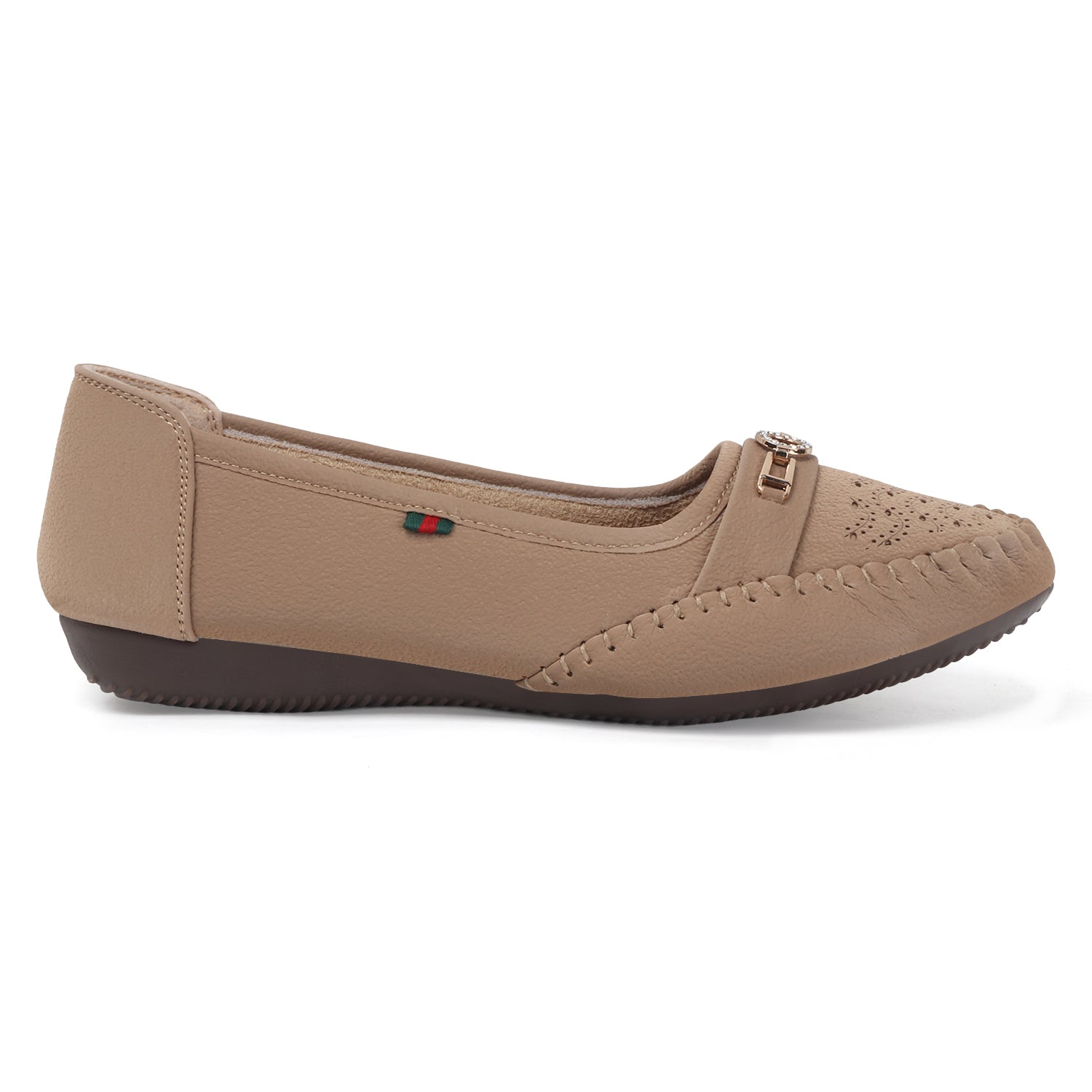 Classic comfort with a touch of elegance. Bella Moccasin in Sandy Beige features intricate perforations, moccasin stitching, and a stone-studded metallic accent — perfect for refined everyday wear.