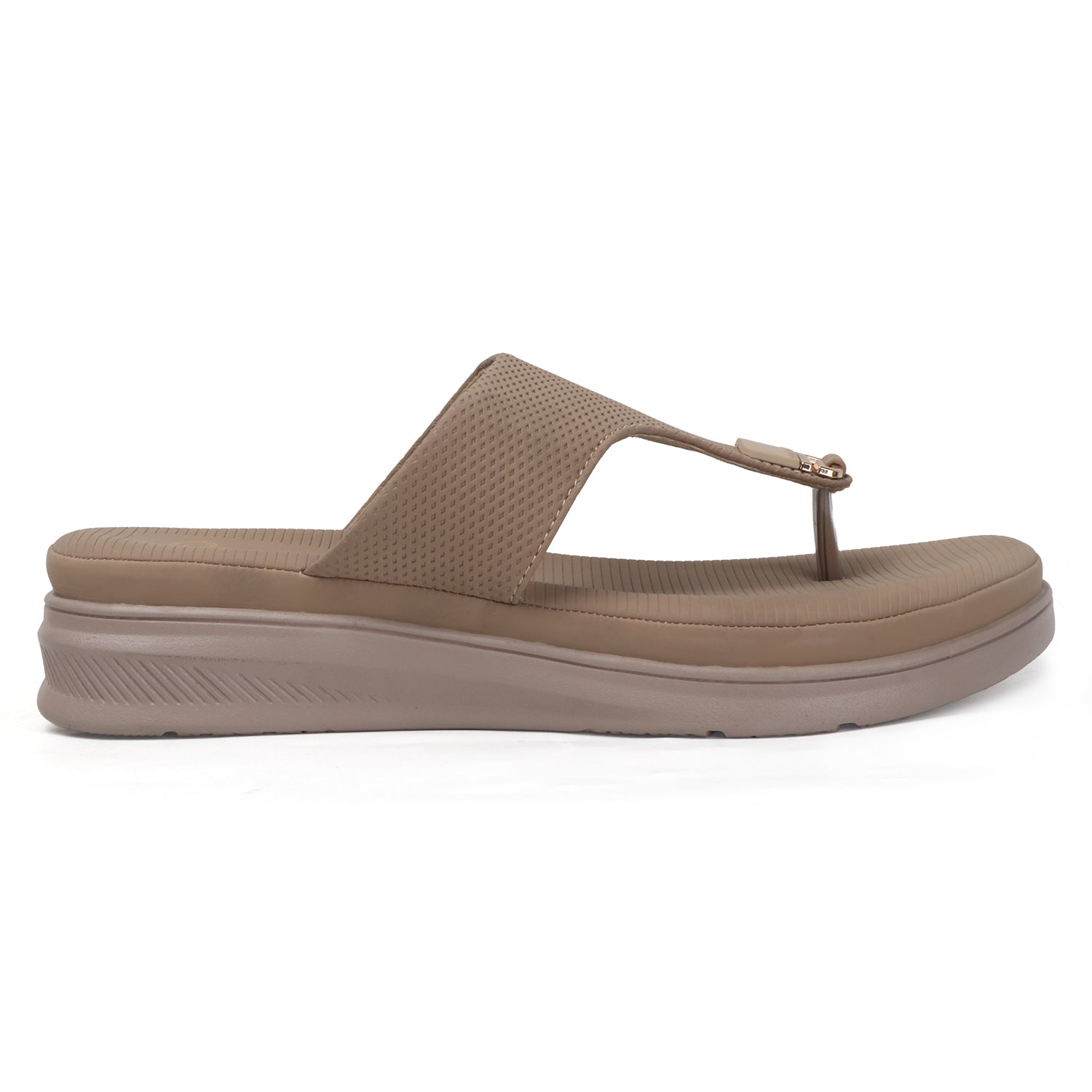 Bold strap, cushioned ease. The Sole Soft™ Comfort Buckle in Almond Beige features a broad textured strap with a metallic accent and a ribbed cushioned footbed — offering premium comfort for every step.