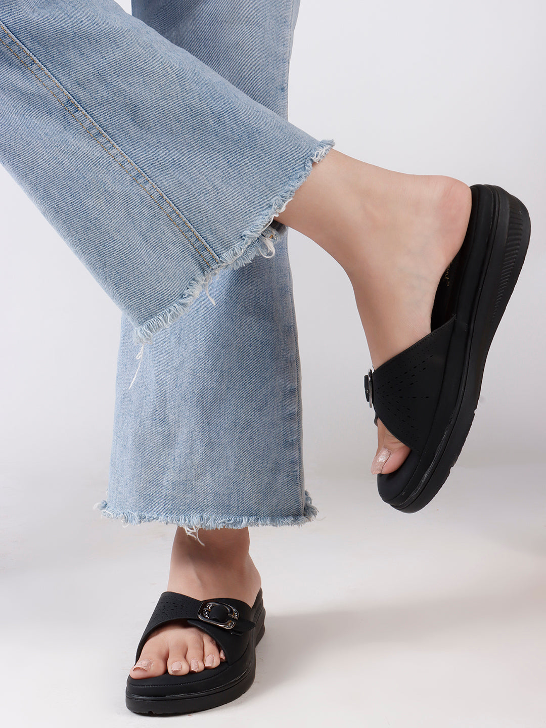 Upper Material: Smooth faux leather with perforated design & decorative sparkle buckle