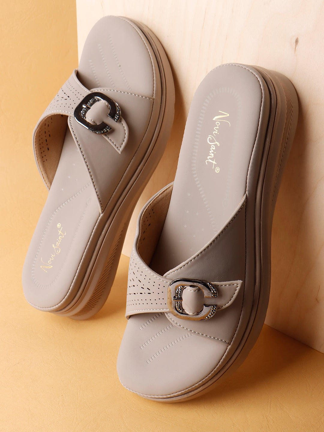 Closure: Slip-on with fixed buckle detail (non-adjustable)