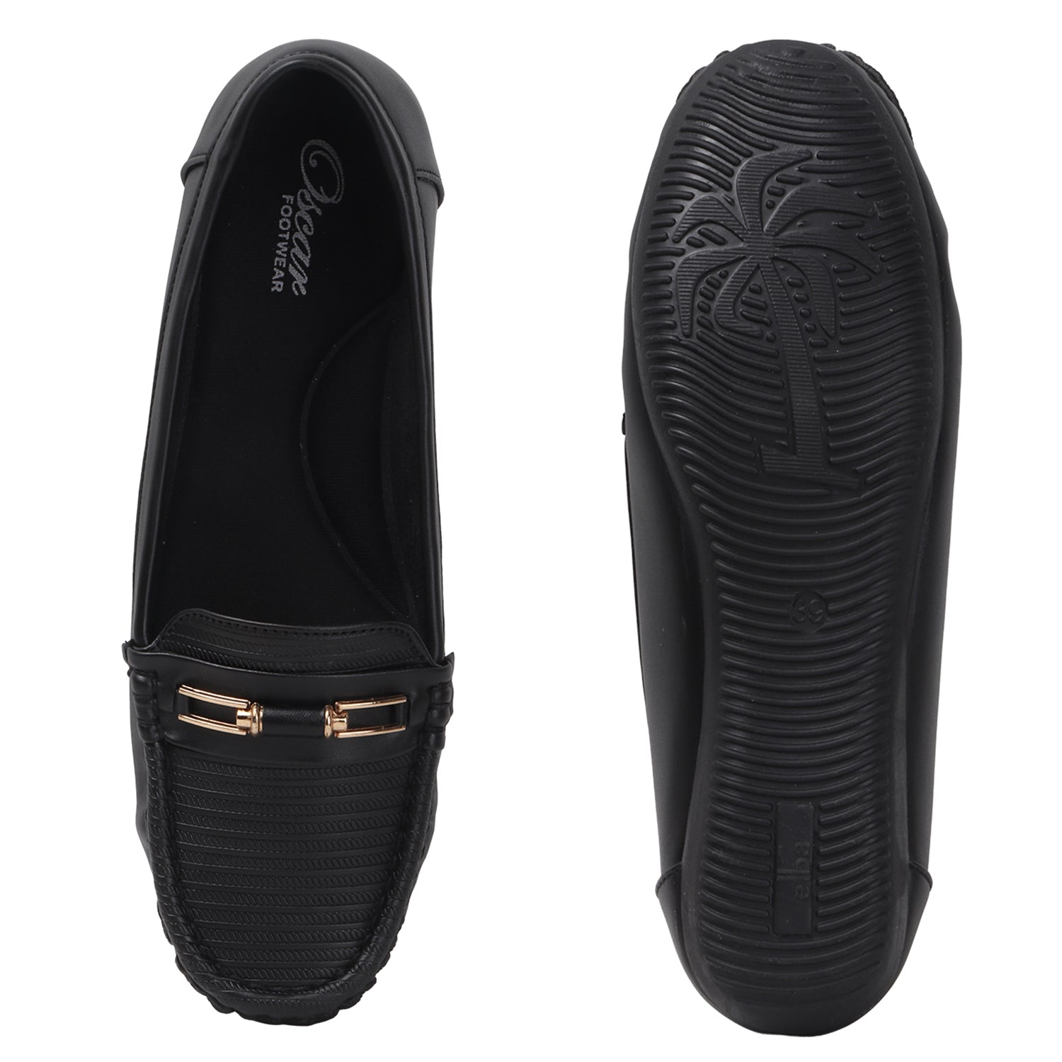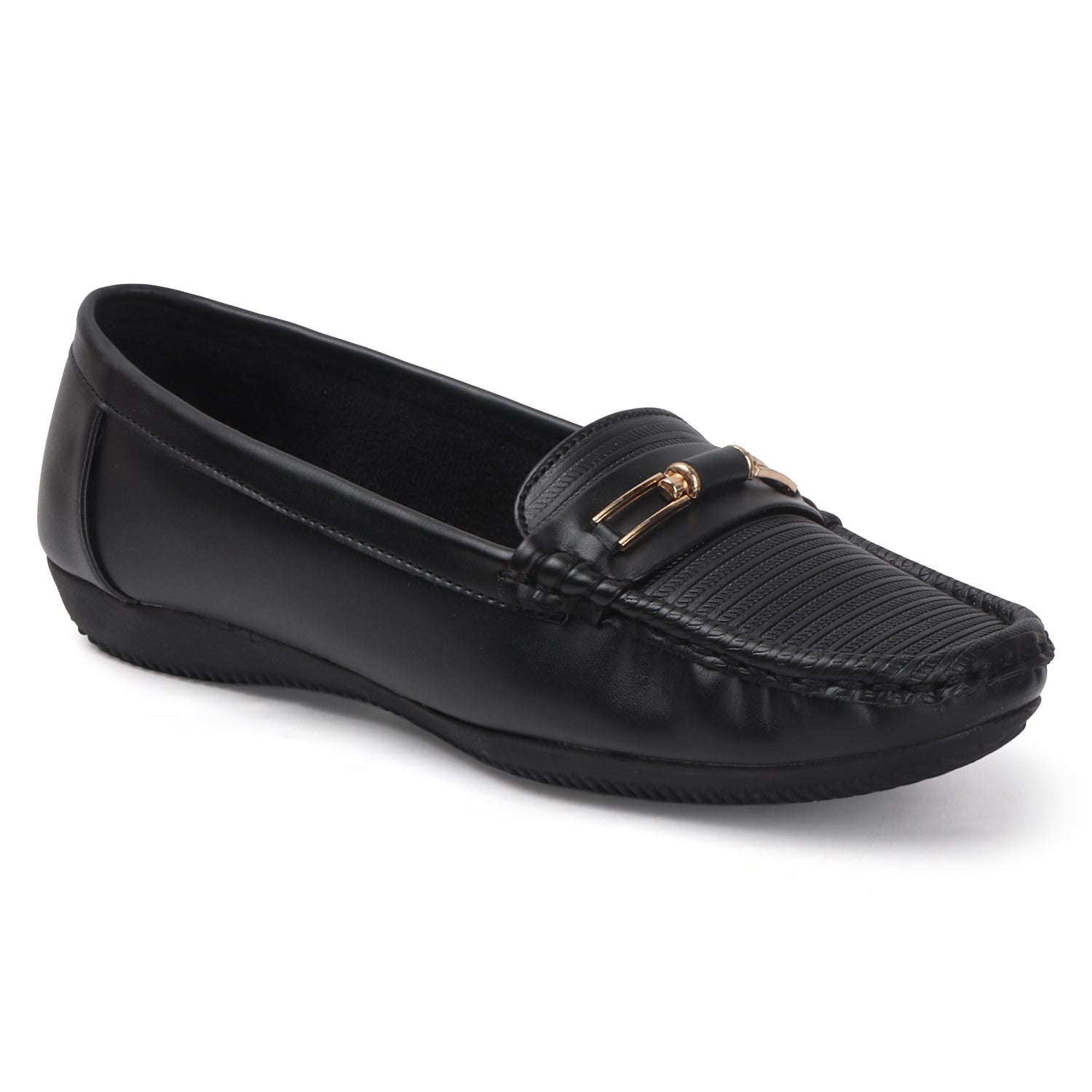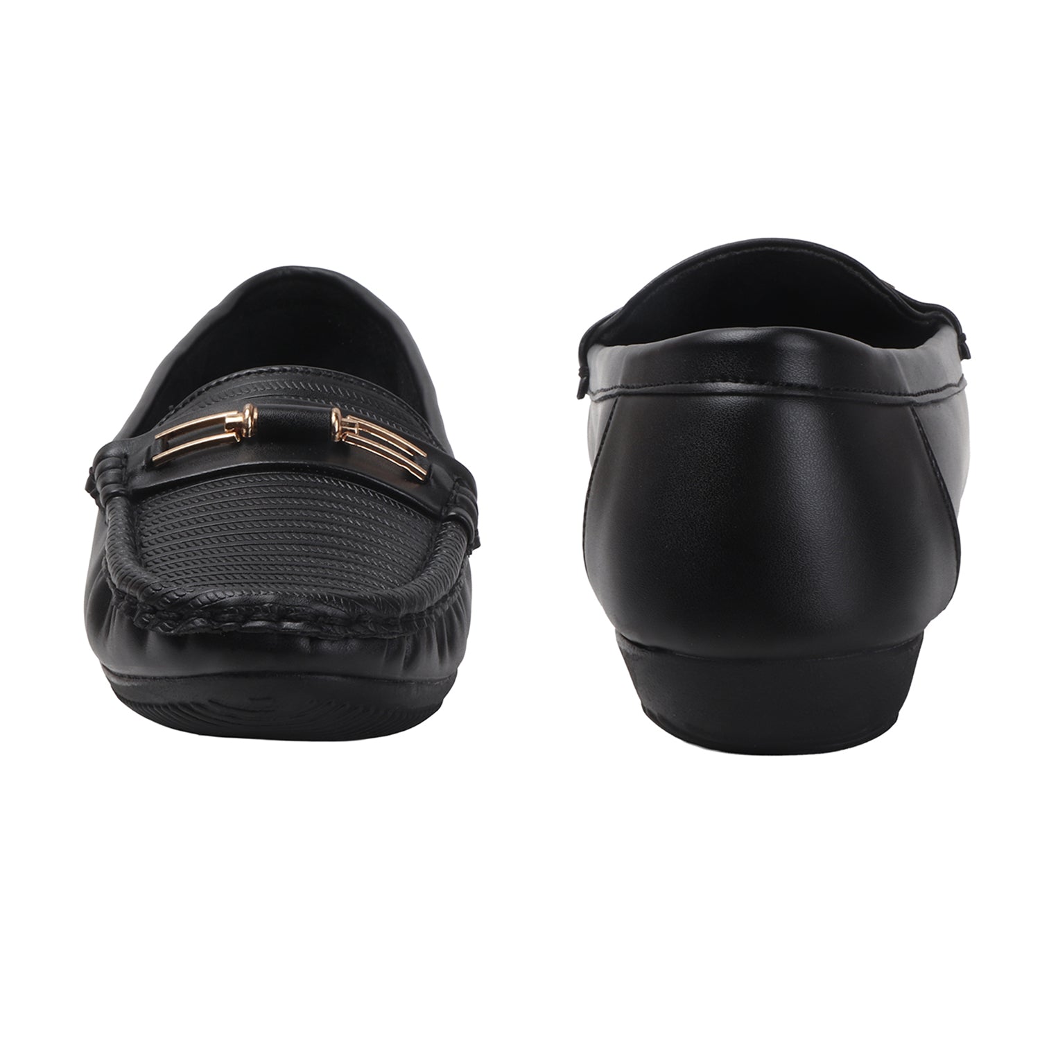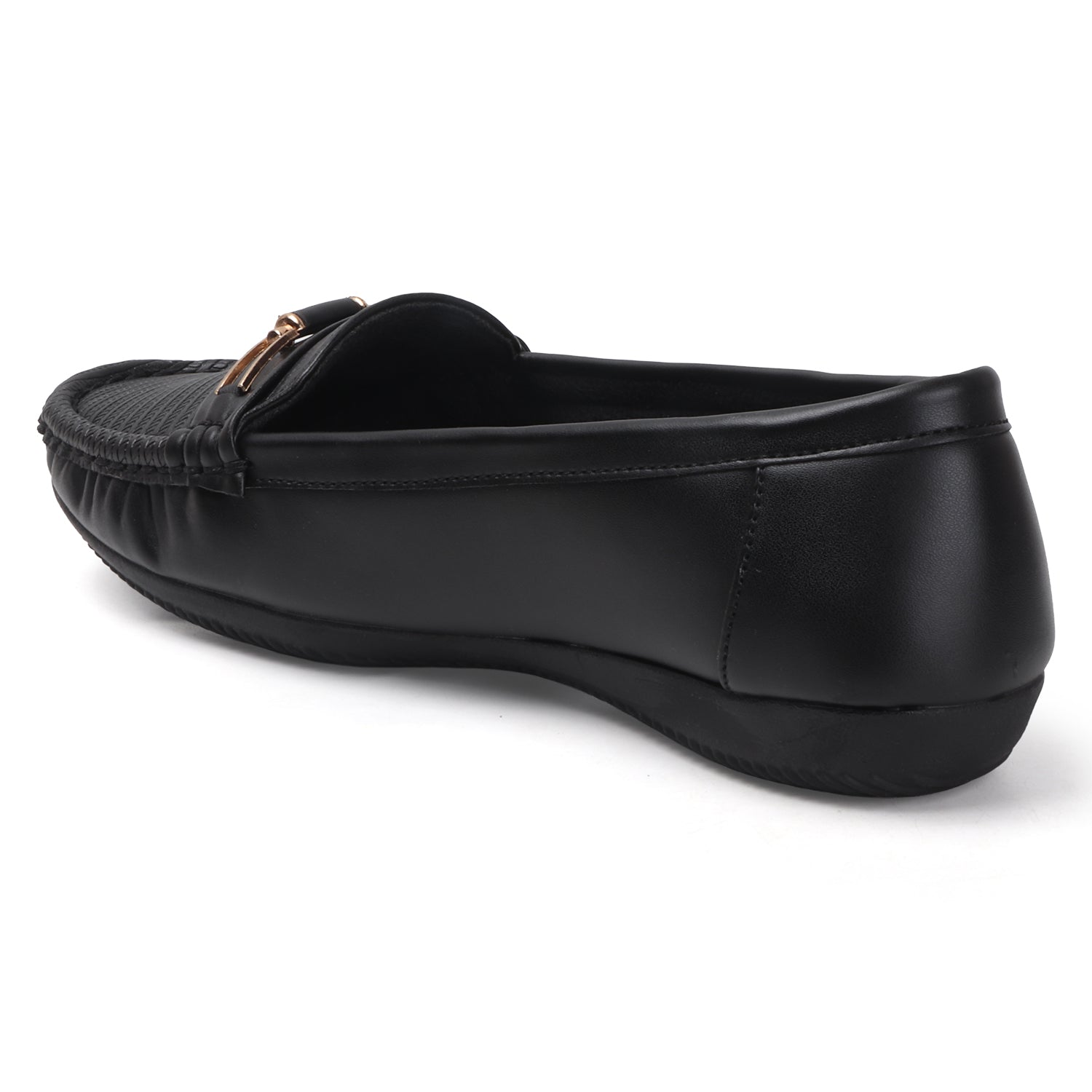 Toe Design: Moccasin-style stitching with metallic horsebit accent